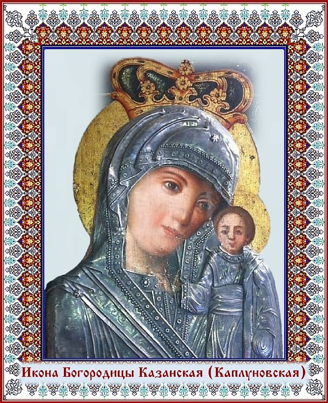 ИКОНА БОГОРОДИЦЫ КАЗАНСКАЯ (КАПЛУНОВСКАЯ) В конце XVII века в 20 верстах от города Ахтырки Харьковской губернии, в недавно возникшем селе Каплуновке, на реке Хухре, жил благочестивый священник отец Иоанн Ильич Уманов. В 1689 году ему явился чудотворный образ Богоматери. 8 сентября, в день Рождества Богородицы, он видел во сне старца, который сказал ему, что через три дня к нему придут три иконописца: один 70-ти, другой 80-ти, третий 90 лет. У этого третьего старец приказал взять связку икон, семь верхних возвратить иконописцу, а восьмую, которая будет Казанской, оставить у себя; за это священнику обещаны от Богоматери милость и благодать. После этого сна отец Иоанн постился и ежедневно совершал литургию. На третий день, возвращаясь из церкви домой, он увидел идущих к нему трёх престарелых иконописцев. Он пригласил их к себе, радушно принял, затем у старшего взял связку икон, и восьмая, как было во сне предсказано, оказалась Казанской. Иконописцы в благодарность за хороший приём хотели отдать икону даром и едва согласились взять за неё 15 копеек. Отец Иоанн Уманов поставил икону у себя в комнате и день и ночь теплил перед ней свечу. В ночь на третье воскресенье он увидел во сне Деву необычайной красоты, Которая, коснувшись его рукой, сказала ему: — Иерей Иоанн, не вынуждай Меня быть в твоей храмине, а отнеси в Мою церковь! Церковь в Каплуновке была в честь Рождества Богоматери. Когда отец Иоанн проснулся, келья его была озарена ярким светом. Он собрался с духом, подошёл к иконе и увидел, что из глаз лика Богоматери струятся по доске слезы. Он немедленно собрал народ, рассказал о происхождении иконы и о событиях последней ночи, и икона после молебна торжественно была перенесена в храм, где прославилась чудесами. По имени села ее стали звать Каплуновской. Отец Иоанн долго ещё после этих событий служил в селе и утешался все возраставшей славой иконы. Ему же выпала на долю радость видеть то общегосударственное значение, которое икона получила во время войны Карла XII с Петром Великим. Когда шведский король Карл XII вторгся со своими войсками в Малороссию, Пётр, идя к нему навстречу и ища помощи Небесной, вызвал к себе в Харьков отца Иоанна с Каплуновской иконой, которую и оставил при армии. Между тем Карл, добравшись с Мазепой до Каплуновки, расположился там на отдых и занял дом отца Иоанна. Несколько солдат Карла хотели поджечь церковь, но дрова, которыми они обложили храм, не загорались. Карл видел всё это из окна и попросил у Мазепы объяснения того, как это люди не могут зажечь храма. Мазепа сказал, что храм, вероятно, охраняет Богоматерь, так как здесь находится Её икона, признаваемая чудотворной. Шведский король велел привести к себе кого-нибудь из каплуновских жителей. Сыскали одного человека в лесу, и Карл стал расспрашивать его, где стоит Пётр с войсками. Тот отвечал, что в Харькове. Затем Карл спросил, тут ли икона Богородицы. Узнав, что она унесена в армию, он сказал Мазепе: — Церкви и без иконы не могли зажечь, а где будет Она Сама, там, наверное, придётся нам очень плохо. Перед началом Полтавского боя Пётр приказал носить Каплуновскую икону по рядам русской армии и со слезами молился перед образом. Затем после битвы священник Иоанн с иконой был вытребован в Москву и оттуда уже отпущен с святыней домой. Пётр сделал на икону серебряную вызолоченную ризу с др
