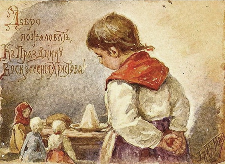 Елизаветы Бём – знаменитая российская художница второй половины девятнадцатого-начала двадцатого века. Елизавета Меркурьевна была популярна и любима современниками. Рисовала для детских журналов и книг Лескова, Тургенева, Крылова, иллюстрировала русские народные сказки. Художница занималась росписями стеклянной посуды и эти работы выставлялись на всемирных выставках в Чикаго, Париже Милане, Берлине, Лондоне, Нижнем Новгороде, везде были отмечены высокими наградами, в том числе, золотыми медалями. В начале 20 века Елизавета Меркурьевна много работала над почтовыми открытками, сразу ставшими популярными как у простого народа, так и у высшего сословия. В них словно выкристаллизован образ Руси. На открытках изображены, в основном, дети в старинных русских народных костюмах, а также написаны поговорки из Словаря Владимира Ивановича Даля – собирателя живого великорусского языка. Ну, как не улыбнуться, читая строки: «Тетка Меланья пекла оладьи, дедушка Елизар все пальчики облизал», «Русы кудри у молодца – сто рублей, буйная головушка – тысячу, а всему молодцу цены нет». Есть и серьезные открытки с приглашениями на Воскресение Христово, на Рождество с такими выражениями: «Напитай Господи малым кусом» или «Встал, умылся, Богу помолился и закусил». Сборники открыток печатались в России и во Франции. Художница умерла за неделю до начала первой мировой, в возрасте 71 года. Принадлежала она к старинному роду выходцев из Золотой Орды, которым великий князь московский Иван Васильевич Третий пожаловал русское дворянство, поместье под Ярославлем и нарек Эндауровыми.