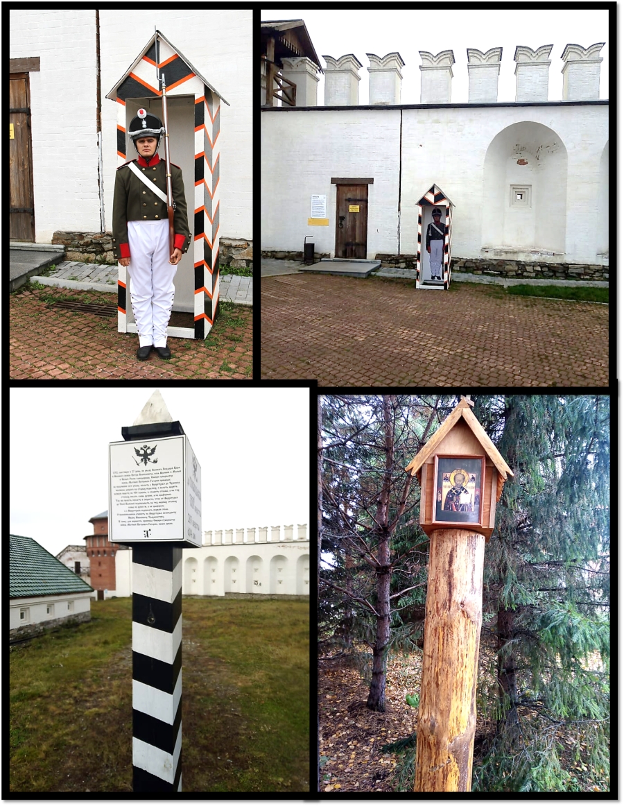 В последнее время площадь Верхотурского Кремля украсилась достопримечательностями прошлого. Так, вход на смотровую площадку на северной башне теперь охраняет русский солдат в форме 1812 года. Все доподлинно, как и было: темно-зеленый мундир, кивер на голове, штуцер в руках. Местные мастера изготовили для него и будочку – точь-в-точь такую же, в какой раньше солдаты охраняли кремлевскую территорию. В девятнадцатом веке в Верхотурье охрана кремля осуществлялась силами так называемой «инвалидной команды» – военнослужащими, которые получили увечья и ранения во время службы в действующей армии. Недалеко от будки располагается верстовой столб, на котором указано в верстах расстояние до Соликамска и Тобольска, начертан указ сибирского губернатора Матвея Гагарина. Есть в кремле и старинный русский крест-голубец с иконой Николая Чудотворца. Такие в старину ставились на дорогах, чтобы путникам можно было помолиться.