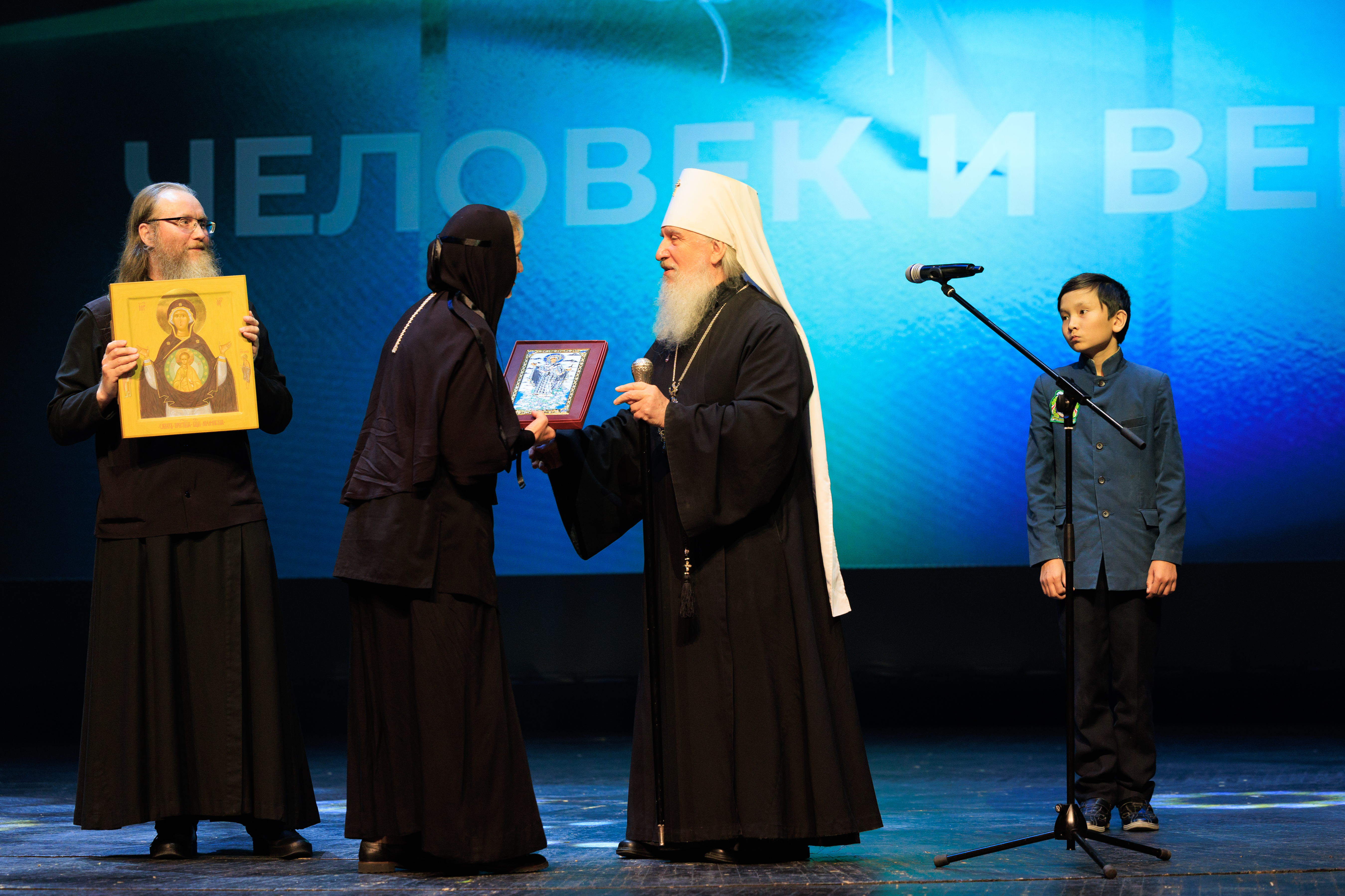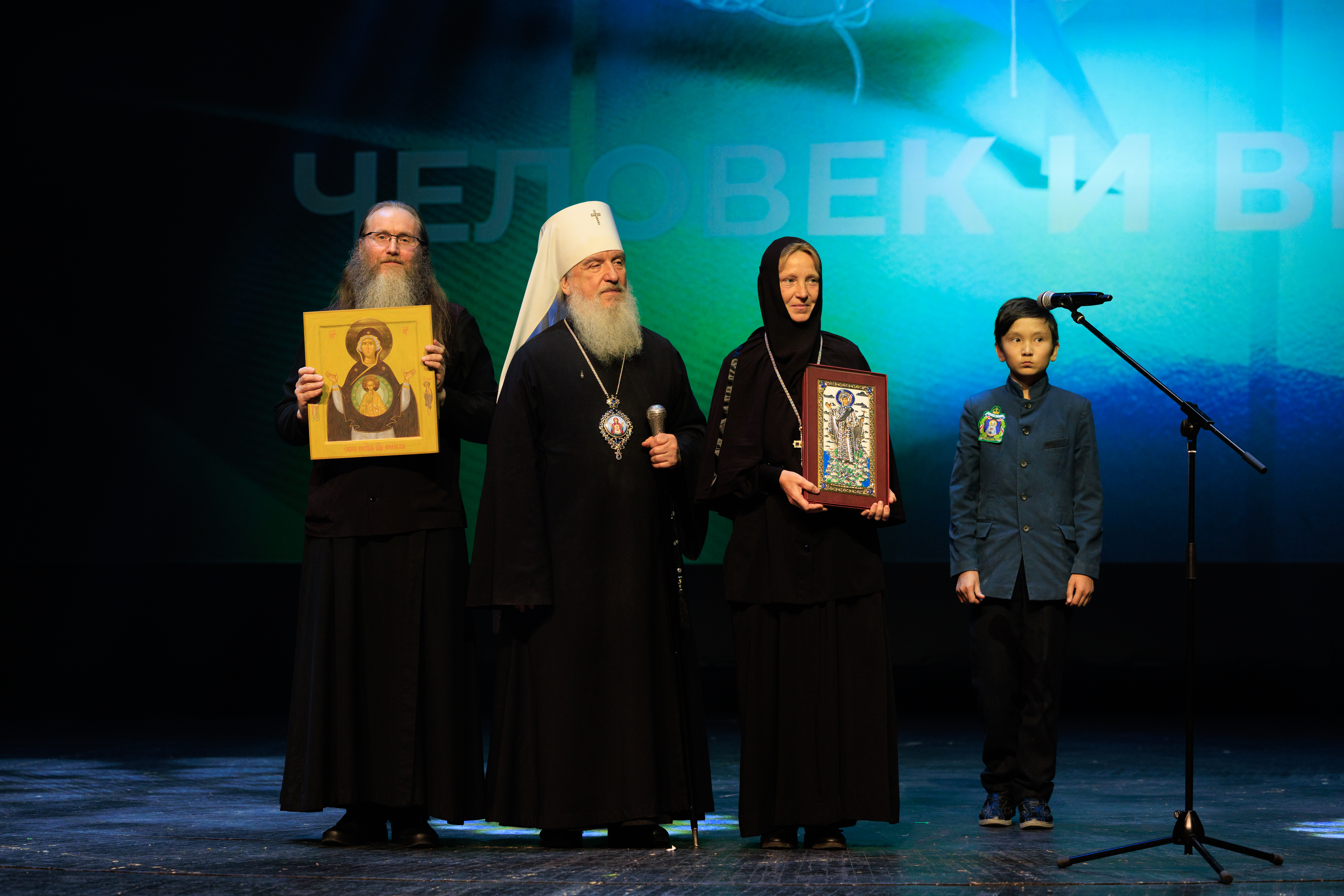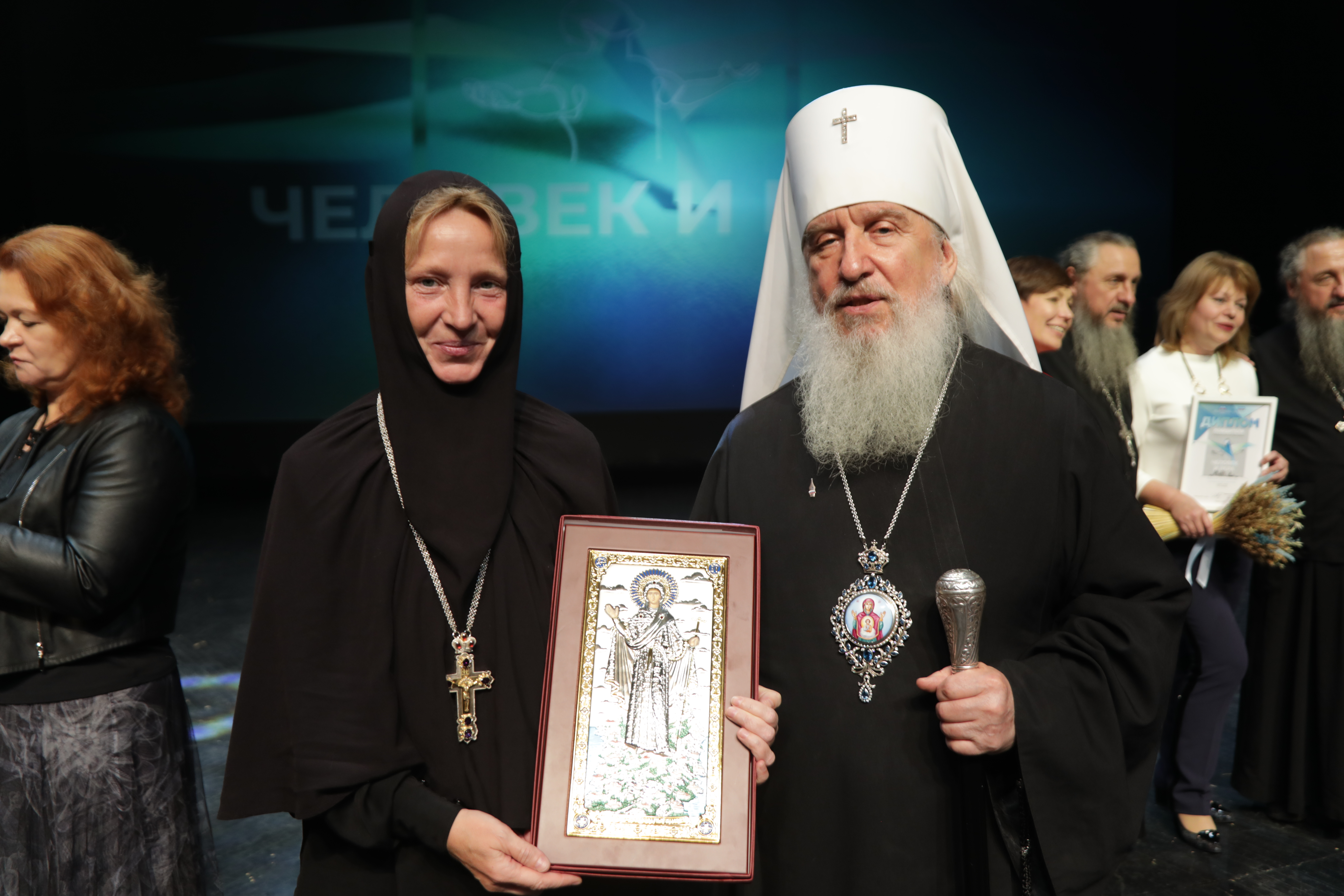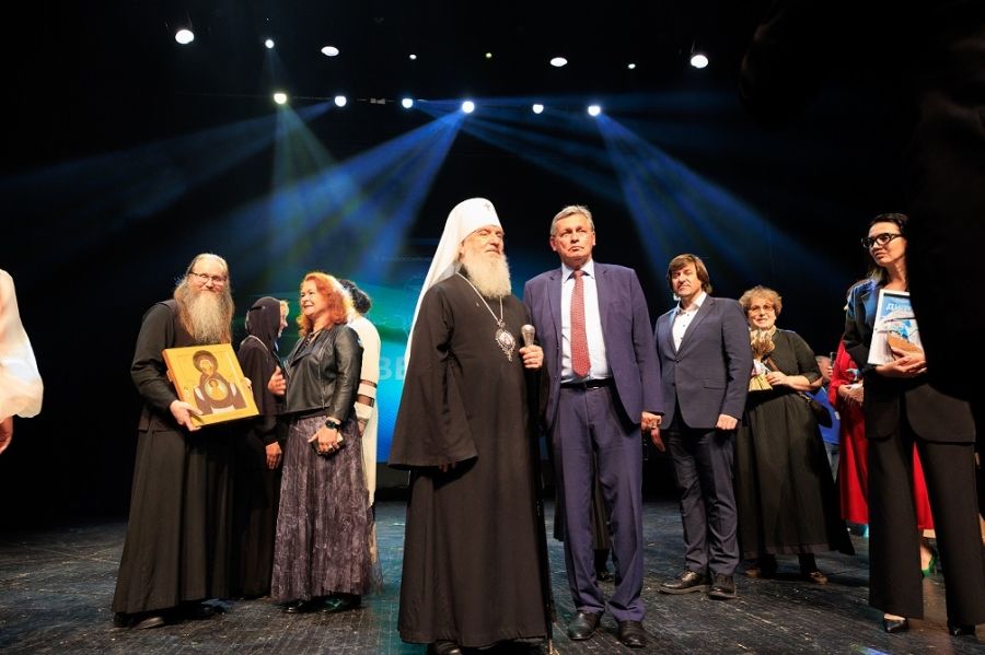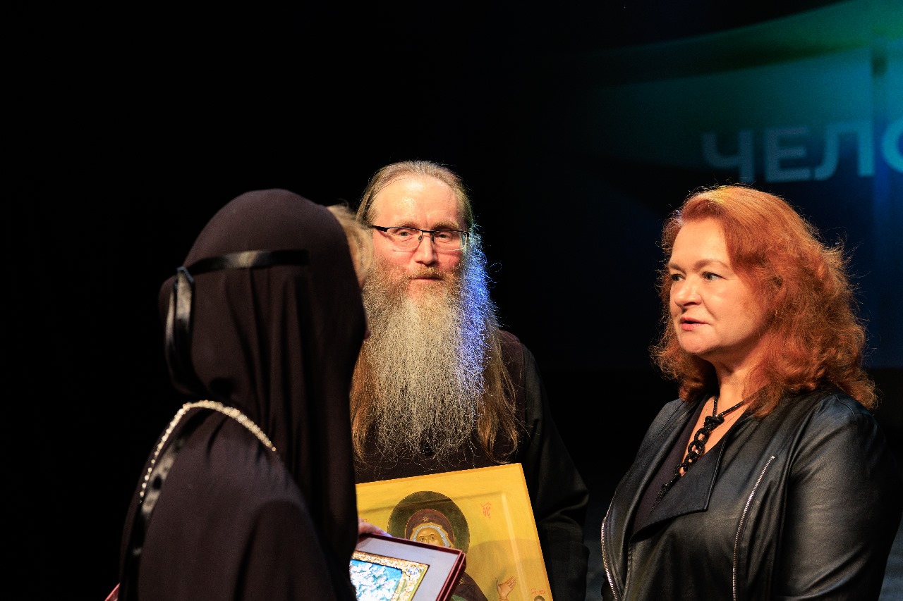 На сцене команда победителей – представители съёмочной группы ВГТРК «Регион-Тюмень», а также участники фильма «Верхотурье. Город на каменном мече»: игуменья Свято-Покровского Верхотурского женского монастыря матушка Магдалина и пресс-секретарь Свято-Николаевского Верхотурского мужского монастыря брат Владимир.