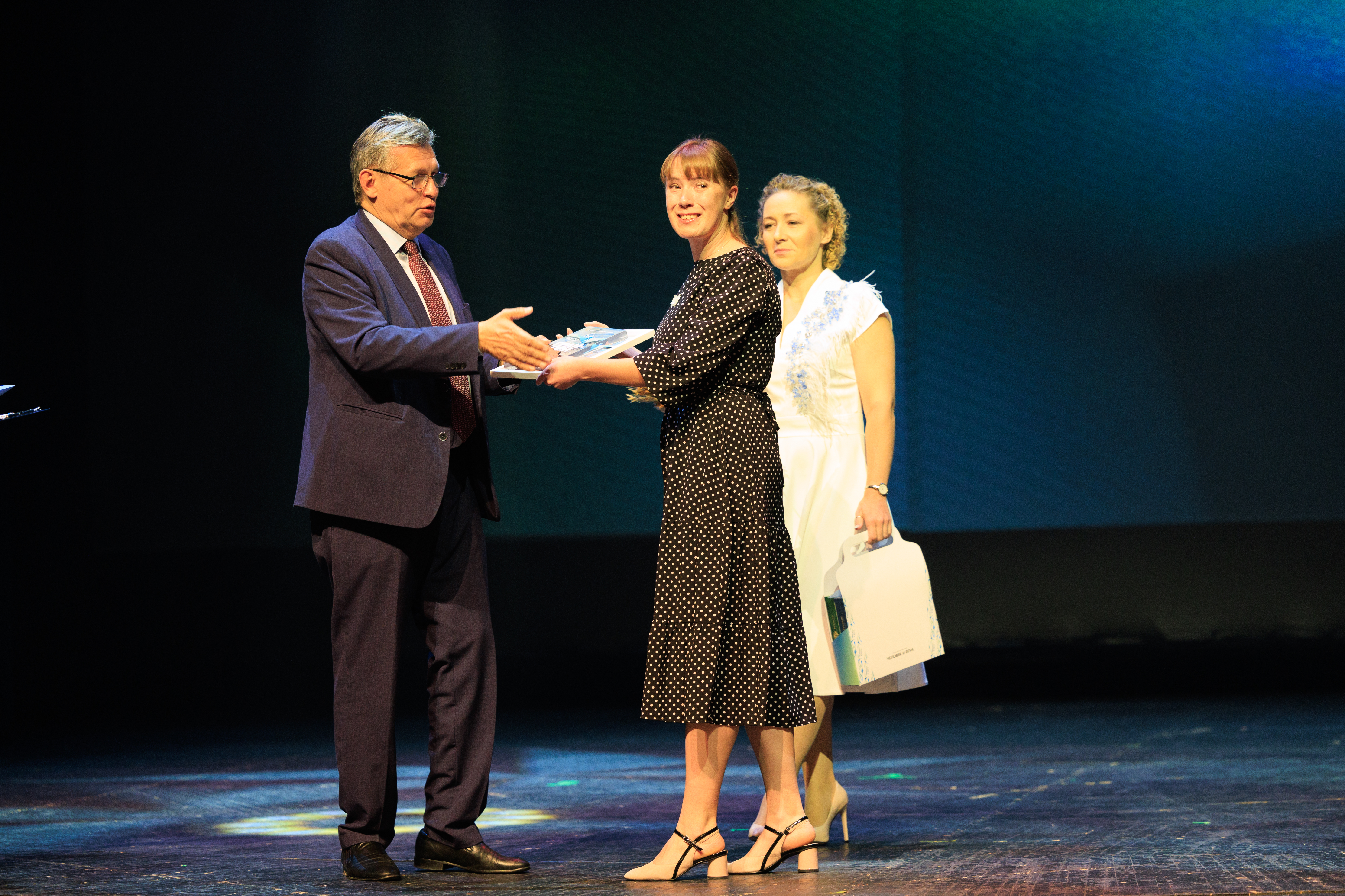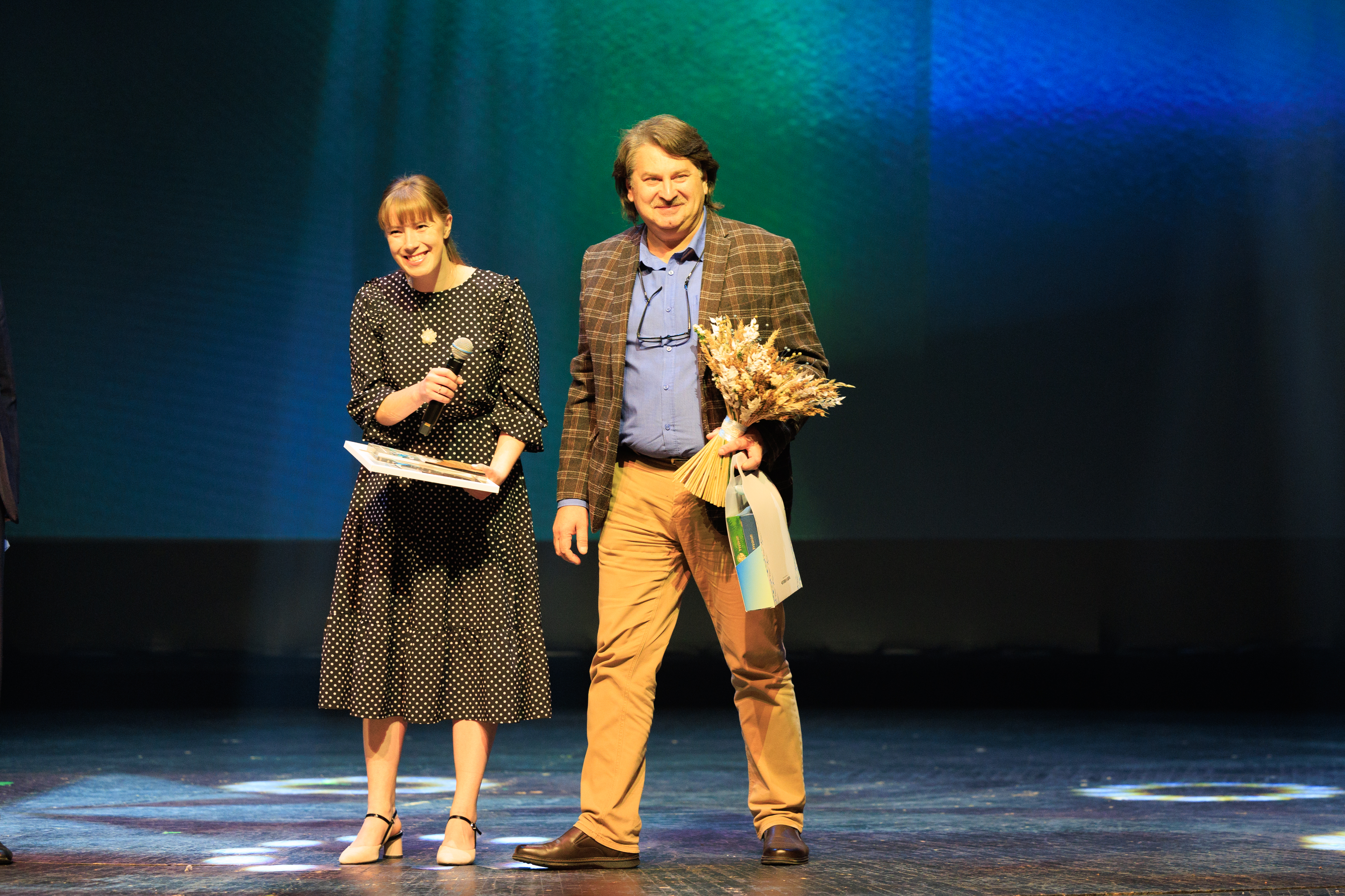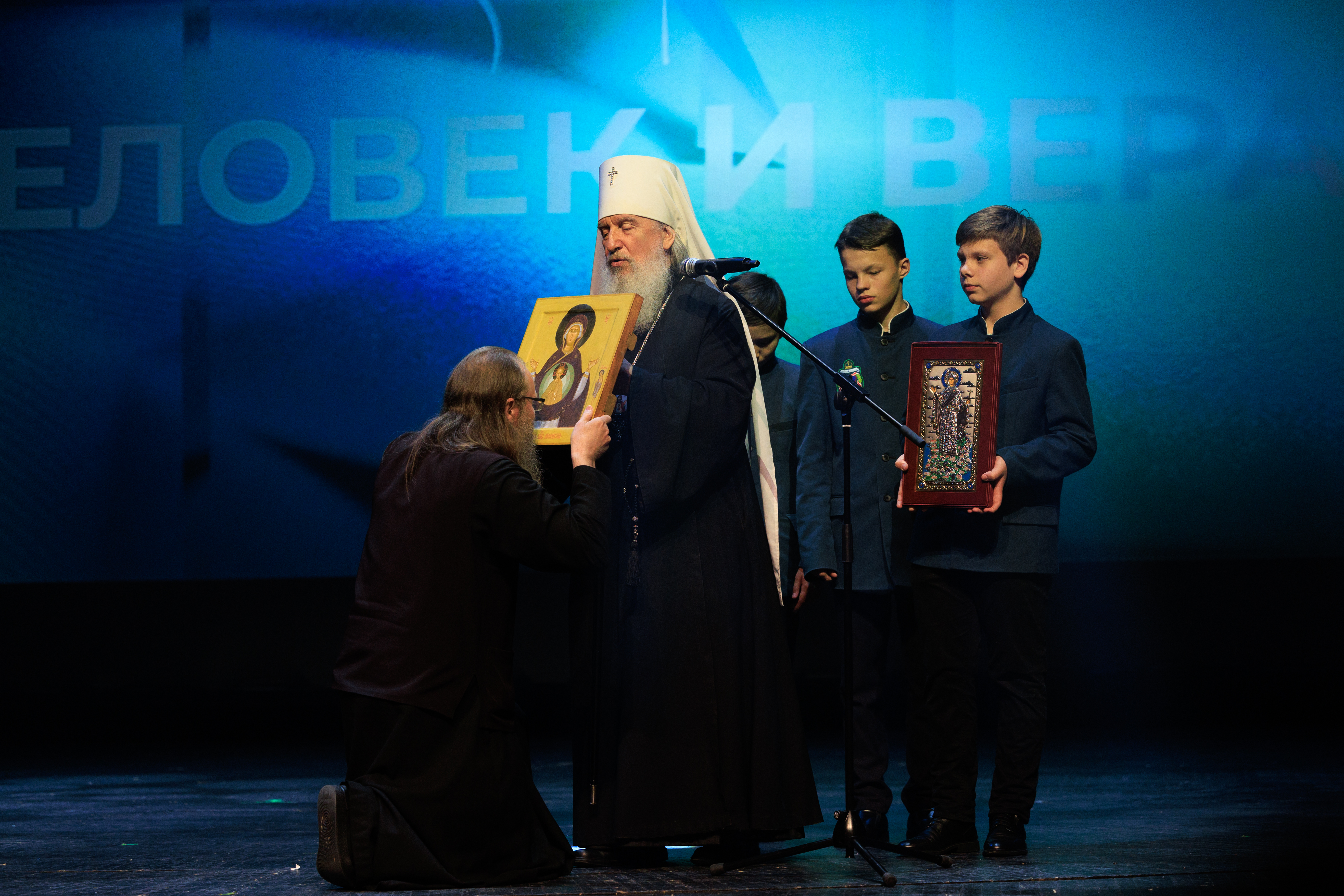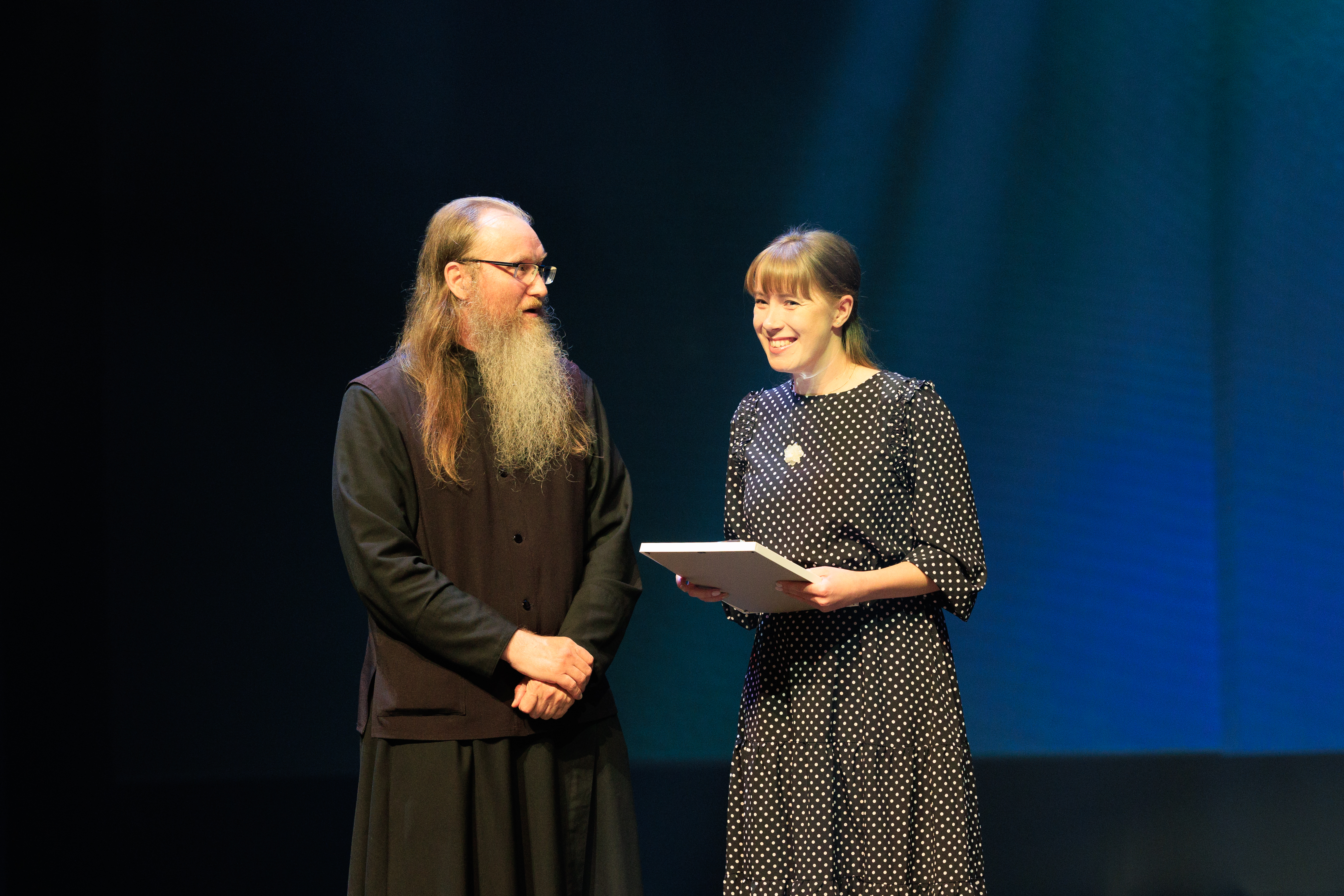 На сцене команда победителей – представители съёмочной группы ВГТРК «Регион-Тюмень», а также участники фильма «Верхотурье. Город на каменном мече»: игуменья Свято-Покровского Верхотурского женского монастыря матушка Магдалина и пресс-секретарь Свято-Николаевского Верхотурского мужского монастыря брат Владимир.