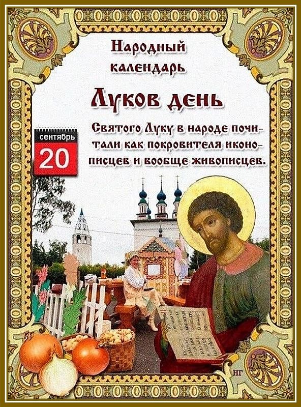 ЛУКОВ ДЕНЬ Народно-христианский праздник Луков День отмечается 20 сентября. В церковном календаре это день памяти преподобного Луки Каппадокийского, игумена Глубокореченского. Название праздника объясняется не только тем, что настало время убирать лук, но и упоминанием в святцах преподобного Луки. Созвучие его имени с огородным растением оказалось достаточным, чтобы день памяти преподобного назвать «луковым», а значит наиболее благоприятным для работ с корнеплодом. С этого дня начинали не только убирать лук, но и торговать им. По виду и качеству луковиц определяли, какой будет зима: «Если шелухи на луковицах много, то зима будет холодной». Лук не только занимал важное место в питании наших предков, издавна были хорошо известны его целебные свойства: Лук да баня все правят. Лук от семи недуг. В старинных лечебниках-травниках писалось о том, что во время эпидемии в комнатах нужно развешать связки луковиц. От этого никакая зараза в дом не проникнет, да и воздух станет чище. А вот во время падежа скота на нитку нанизывали луковицы и головки чеснока, и привязывали на шею домашним животным, чтобы они не заразились.