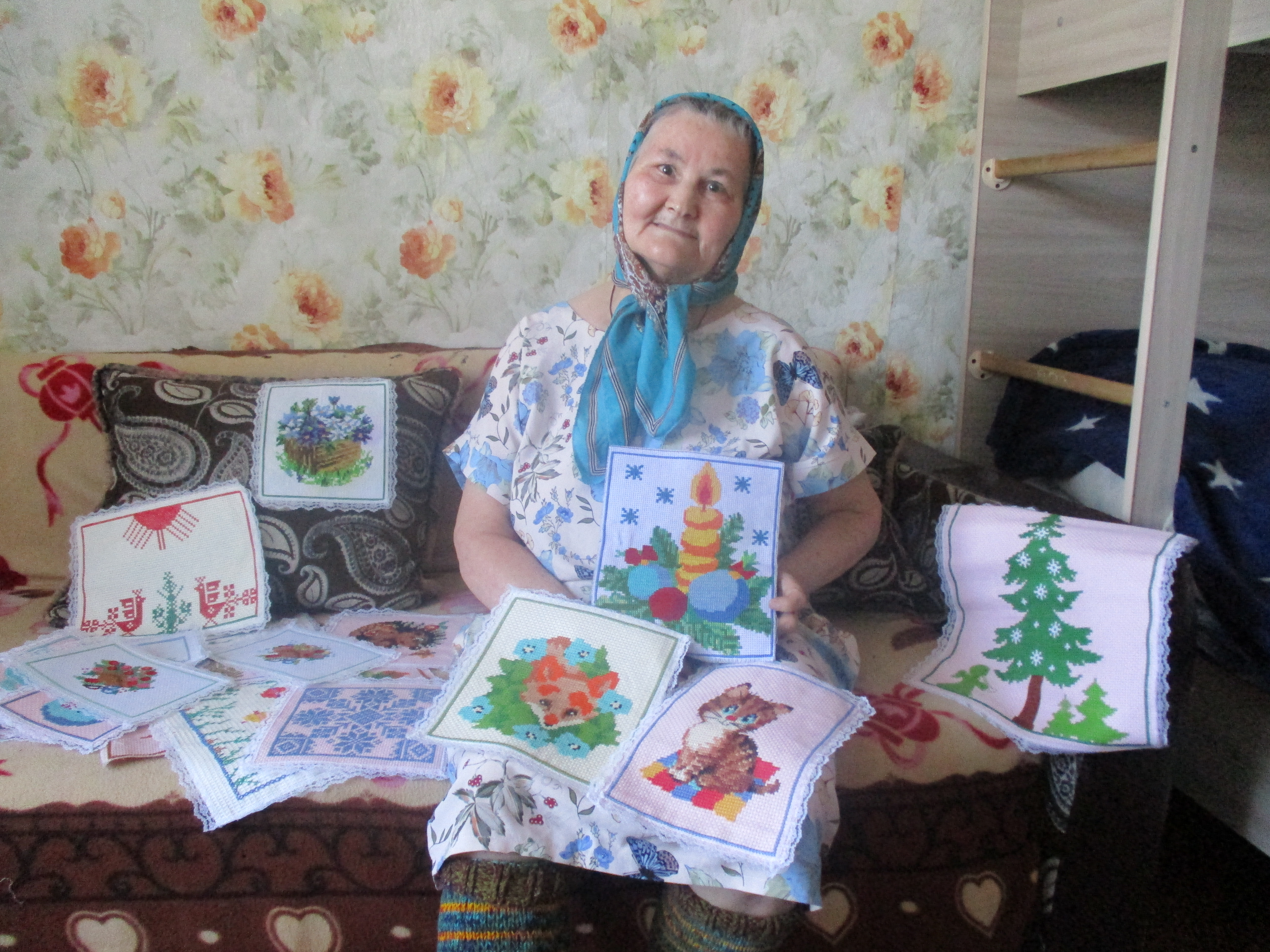 Елену Алексеевну Евсееву, прихожанку и молитвеницу Свято-Троицкого храма, знают многие верхотурцы. Сама Елена Алексеевна с радостью посещала Троицкий собор, и все прихожане для неё были как одна семья. Но 10 лет назад у пожилой женщины случился инсульт: не могла ни ходить, ни говорить. В семье за бабушкой ухаживали все - дочь Юлия, зять Иван, внуки Матвей и Михаил, и постепенно болезнь отступила. Как считает сама Елена Алексеевна, на то была воля Божья, чтобы она заново научилась ходить и говорить. Належавшись за эти годы, женщина с воодушевлением принялась за рукоделие – вышивку, правда только одной рукой, левой. Вскоре наловчилась, ведь технология и инструменты простые – ткань, иголки да нитки. Прижмет к себе поближе материал и работает одной рукой. Стали получаться салфеточки и полотенца с красивыми узорами: ангелочки, петушки, рыбки, лисята, виноград. Рабочее место у бабы Лены прямо в кресле под божницей - днем молится, а вечером трудится над рукодельем. Не забывают её и прихожане, и батюшки Свято-Троицкого храма отец Виктор (Титов) и отец Владимир (Иванов) – заезжают и заходят к ней в домик в поселке Актай, чтобы ободрить, поддержать. Зять с дочерью иногда возят бабушку на службы в храм. Младший внук Миша воспитанник воскресной православной школы «Росинка». Оба внука с удовольствием помогают бабушке по дому и хозяйству: дров принести, полы помыть, грядки в огороде вскопать. И за всё пожилая женщина благодарна Богу: за возможность бывать в храме, за то, что семья дружная и счастливая, за то, что люди её не забывают, а также за солнышко в окне, за ясный Божий день, что с молитвой прожит.
