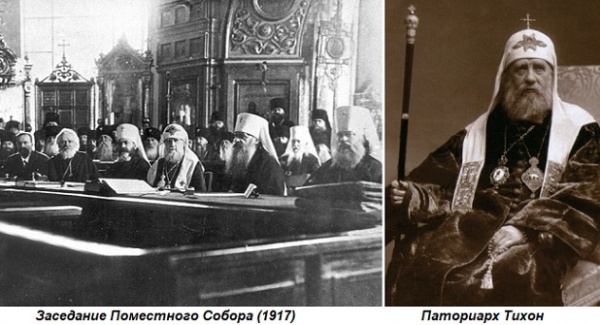 Открытие Поместного Собора состоялось в праздник Успения Пресвятой Богородицы в 1917 году в Успенском соборе Московского Кремля, под колокольный звон сотен московских церквей. Собор, продолжавшийся более года, осуществлял свою работу в три сессии. Одним из важнейших вопросов церковной жизни было восстановление в Русской Церкви Патриаршества. По мере ослабления власти Временного правительства идея восстановления Патриаршества находила все большую поддержку среди делегатов. 28 октября (10 ноября) в результате голосования Собор вынес историческое постановление: 1. В Православной Российской Церкви высшая власть – законодательная, административная, судебная и контролирующая – принадлежит Поместному Собору, периодически в определенные сроки созываемому в составе епископов, клириков и мирян. 2. Восстанавливается Патриаршество, и управление церковное возглавляется Патриархом. 3. Патриарх является первым между равными ему епископами. 4. Патриарх вместе с органами церковного управления подотчетен Собору. Избрание Патриарха по жребию состоялось 5 (18) ноября в Храме Христа Спасителя по окончании Божественной литургии, которую совершали будущие священномученики митрополит Киевский Владимир и митрополит Петроградский Вениамин в сослужении архиереев и пресвитеров. Слепой старец-затворник Зосимовой пустыни иеросхимонах Алексий (Соловьев) вынул из ковчежца жребий и передал его митрополиту Владимиру, который огласил имя избранника: «Тихон, митрополит Московский. Аксиос!»