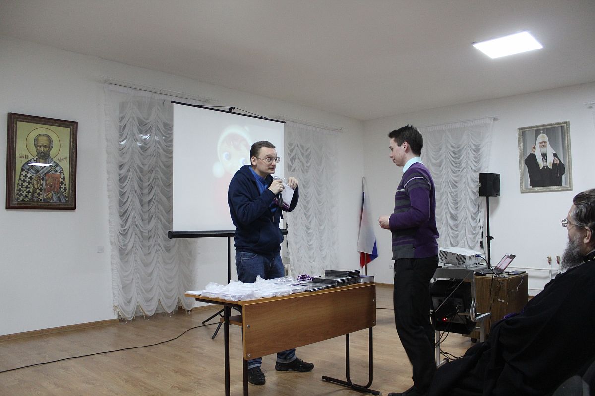 Василий Леонидович познакомил участников встречи с кинопродукцией, которую выпускает миссионерская киногруппа, а также представил вниманию аудитории авторский кинопроект «Под солнцем». В лекции были показаны фрагменты из различных документальных фильмов и разобраны некоторые факты истории с точки зрения православия. Живая беседа ведущего сопровождалась вопросами, ответы на которые вознаграждались подарками. Каждый, правильно ответивший на вопрос, получил в подарок понравившийся диск. Лекция была познавательна и интересна не только студентам ВПДУ, но и трудникам, которые имели возможность познакомиться с темой православной иконописи.