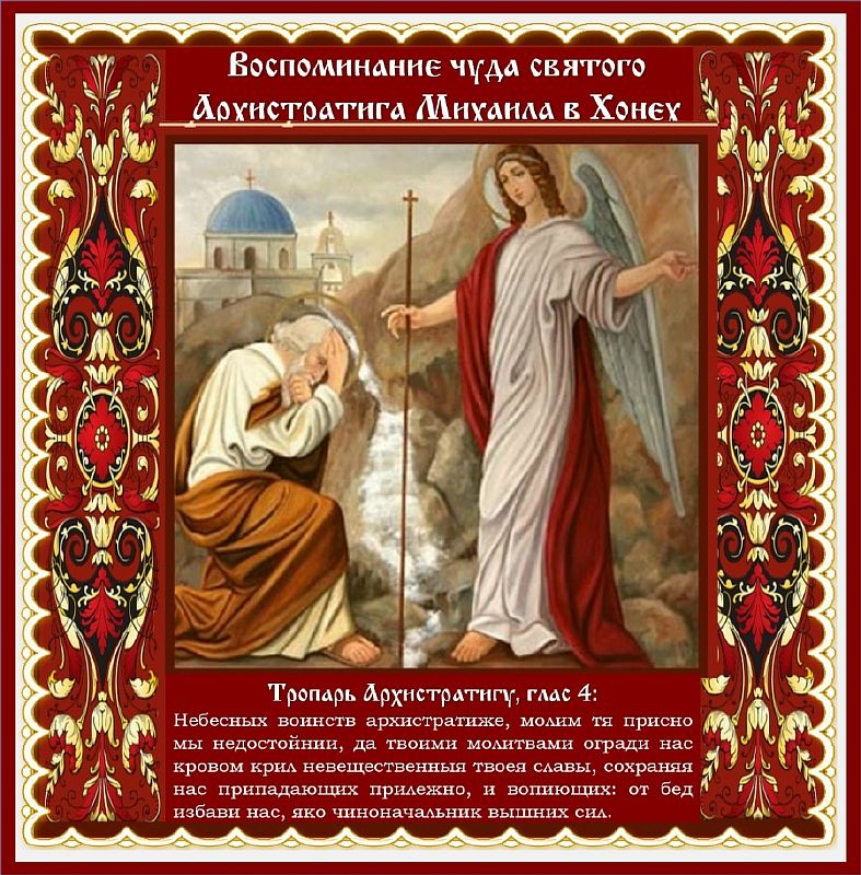 ВОСПОМИНАНИЕ ЧУДА АРХИСТРАТИГА МИХАИЛА, БЫВШЕГО В ХОНЕХ Воспоминание чуда Архистратига Михаила, бывшего в Хонех-Колоссах, отмечается 19 сентября. Архангел Михаил - один из высших ангелов, принимающий самое близкое участие в судьбах Церкви. Архангел Михаил в Писании именуется «князем», «вождём воинства Господня» и изображается как главный борец против дьявола и всякого беззакония среди людей. Поэтому по церковному его именуют «архистратиг», то есть, старший воин, вождь. На иконах Михаил изображается с огненным мечом в руке или копьём, низвергающим дьявола. Чудо Архистратига Михаила произошло в 4 веке. Недалеко от города Иераполя есть местность, называемая Херотопа, и в этой местности находился храм, возведенный во имя Архистратига Михаила. А около того храма проистекал целебный источник. Храм был сооружён одним из жителей города в благодарность святому Архистратигу Михаилу за исцеление его немой дочери. Архистратиг Михаил, явившись в сонном видении отцу немой девицы, ещё не просвещённому святым Крещением, открыл ему, что его дочь получит дар речи, испив воды из источника. Девица действительно получила при источнике исцеление и начала говорить. После этого чуда отец с дочерью и всё его семейство крестились, и усердием благодарного отца был воздвигнут храм в честь святого Архистратига Михаила. К источнику стали приходить за исцелением не только христиане, но и язычники, многие из которых отрекались от идолов и обратились ко Христовой вере. В храме святого Архистратига Михаила более 60 лет исполнял пономарское служение благочестивый человек по имени Архипп. Проповедью о Христе и примером своей богоугодной жизни он многих язычников приводил к вере во Христа. В своем озлоблении на христиан вообще, и в первую очередь на Архиппа, который никогда не отлучался от храма и был примерным служителем Христовым, язычники задумали уничтожить храм и одновременно погубить Архиппа. Они соединили две горные реки в одно русло и направили их течение на храм. Святой Архипп усердно молился Архистратигу Михаилу о предотвращении бедствия. Его молитва была услышана, и к храму явился Архангел Михаил, ударом своего жезла он открыл в горе широкую расселину и повелел устремиться в неё водам бурлящего потока. Храм остался неповреждённым, а язычники в страхе и ужасе бежали. Святой же Архипп и собравшиеся около храма христиане прославили Бога и благодарили святого Архистратига Михаила за помощь. Место, где совершилось чудо, получило название Хоны, что означает «отверстие», «расселина».